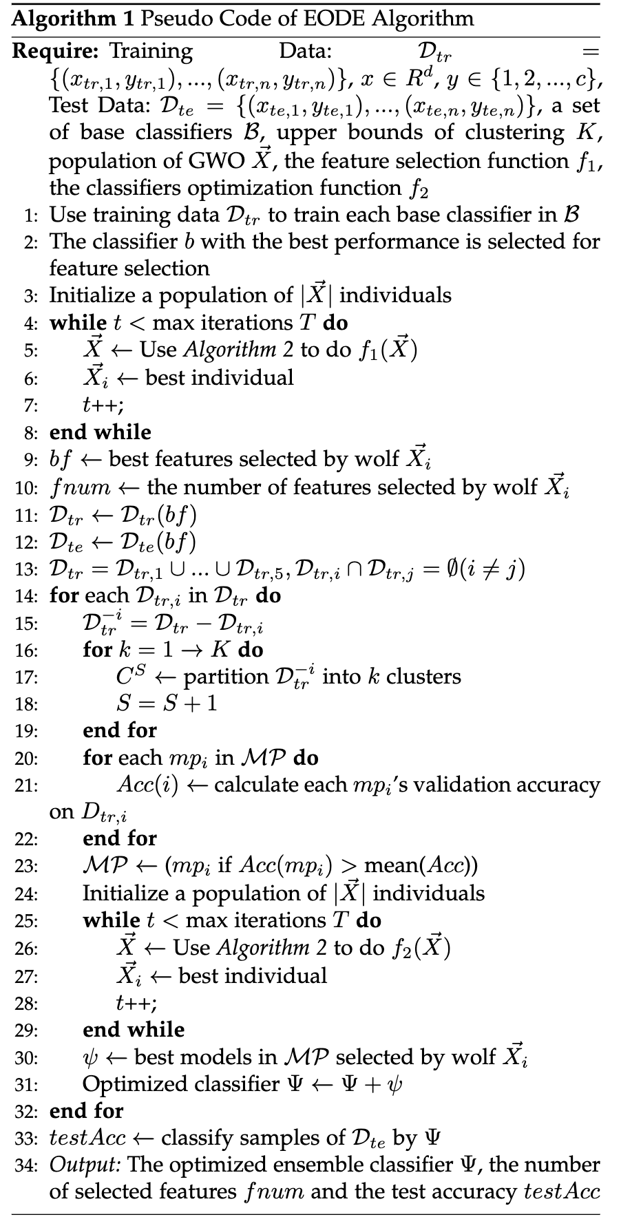 本研究提出了一种名为EODE的新型自然启发式方法,用于快速识别多种癌症类型的生物标记基因。算法的整体框架如图1所示。输入为原始基因表达数据$D_{or} = |{(x_1,y_1),…,(x_n,y_n)|}$,其中$x_i$表示一个包含$dim$个基因的样本,$y$为分子亚型标签,$n$为总样本数。在特征选择步骤中,我们利用GWO在训练集$D_{tr}$上训练模型,从中提取出相关的生物标记基因。首先,从基学习器池$B$(包括判别分析、决策树、K近邻、人工神经网络、支持向量机和朴素贝叶斯)中选择表现最佳的分类器作为特征选择的评估器。随后,我们利用筛选出的特征训练和优化一个多样性集成模型$\Psi$。具体来说,数据首先通过5折交叉验证进行处理。然后,我们使用K-means方法将数据划分为多个子空间,并在这些子空间上训练基学习器,组成模型池。对于池中表现较差的模型,我们将其过滤掉。最后,我们应用GWO优化模型池,找到最佳的模型组合。在测试集上,我们采用多数投票的方式评估最终模型$\Psi$的性能。EODE的整体框架如算法1所示。该方法充分利用GWO的特征选择能力和集成优化策略,在多个癌症基因表达数据集上展现出显著的性能优势,为生物标记基因的快速发现和精准肿瘤学的应用提供了新的解决方案。
