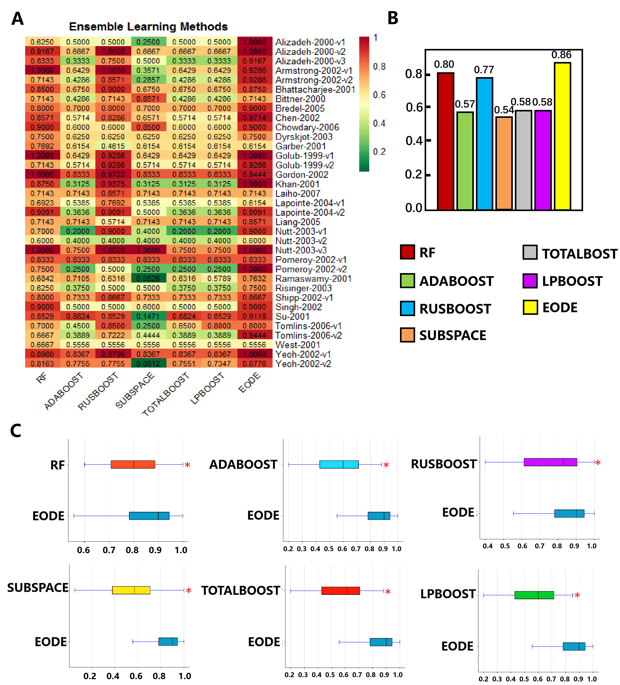我们在涵盖多种癌症类型的35个数据集上进行了实验,结果表明,与四种自然启发的集成方法(PSOEL、EAEL、FESM和GA-Bagging-SVM)、六种基准机器学习算法(KNN、DT、ANN、SVM、DISCR和NB)、六种集成算法(RF、ADABOOST、RUSBOOST、SUBSPACE、TOTALBOOST和LPBOOST)以及七种自然启发的方法(ACO、CS、DE、GA、GWO、PSO和ABC)相比,我们的算法在分类准确性方面表现更好。